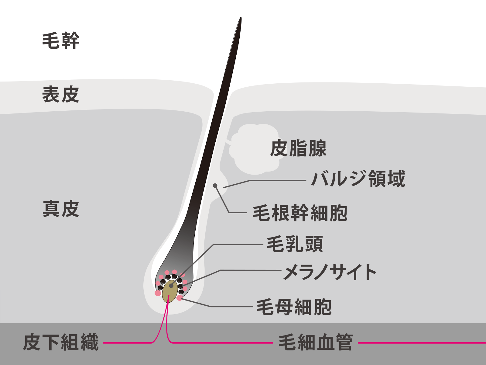 下図「毛の構造」に示すように、毛根部の一番下のふくらんだ部分は「毛球」といい、この毛球の中には毛を作る大切な役割を持つ「毛乳頭」と「毛母細胞」が詰まっています。